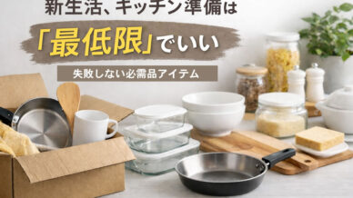 新生活のキッチン準備で失敗しないために、最初に揃えるべき最低限のキッチン用品を厳選。買い直しを防ぐ選び方と、長く使えるアイテムを主婦目線で解説します。
